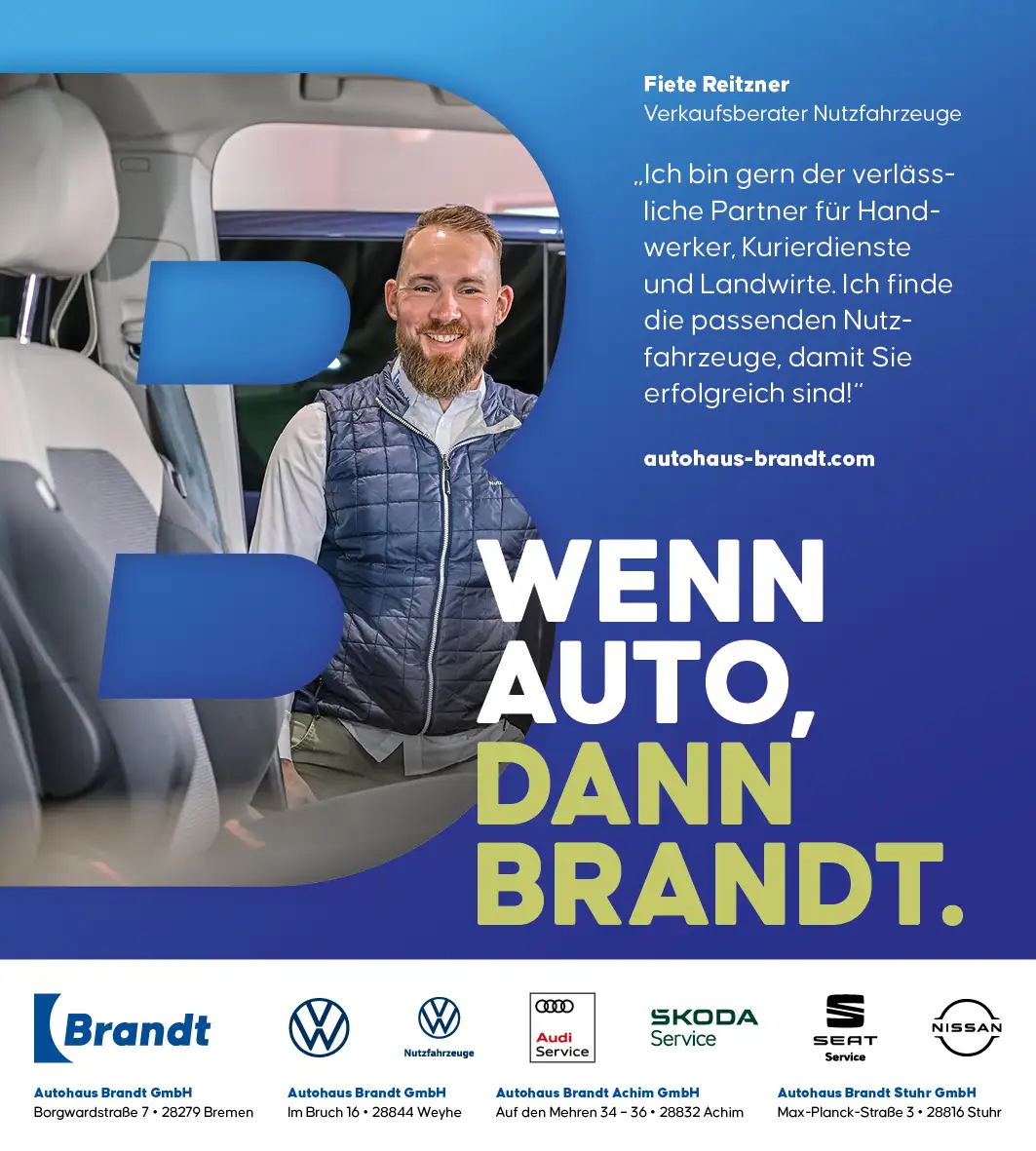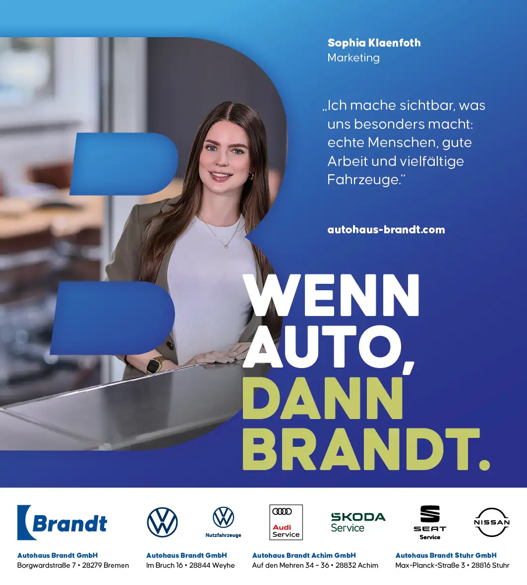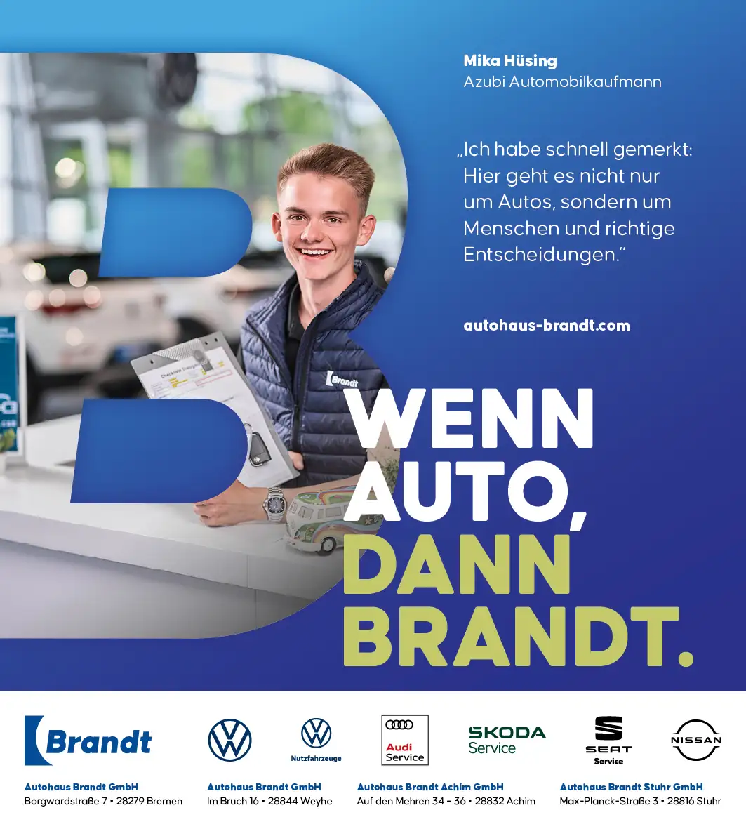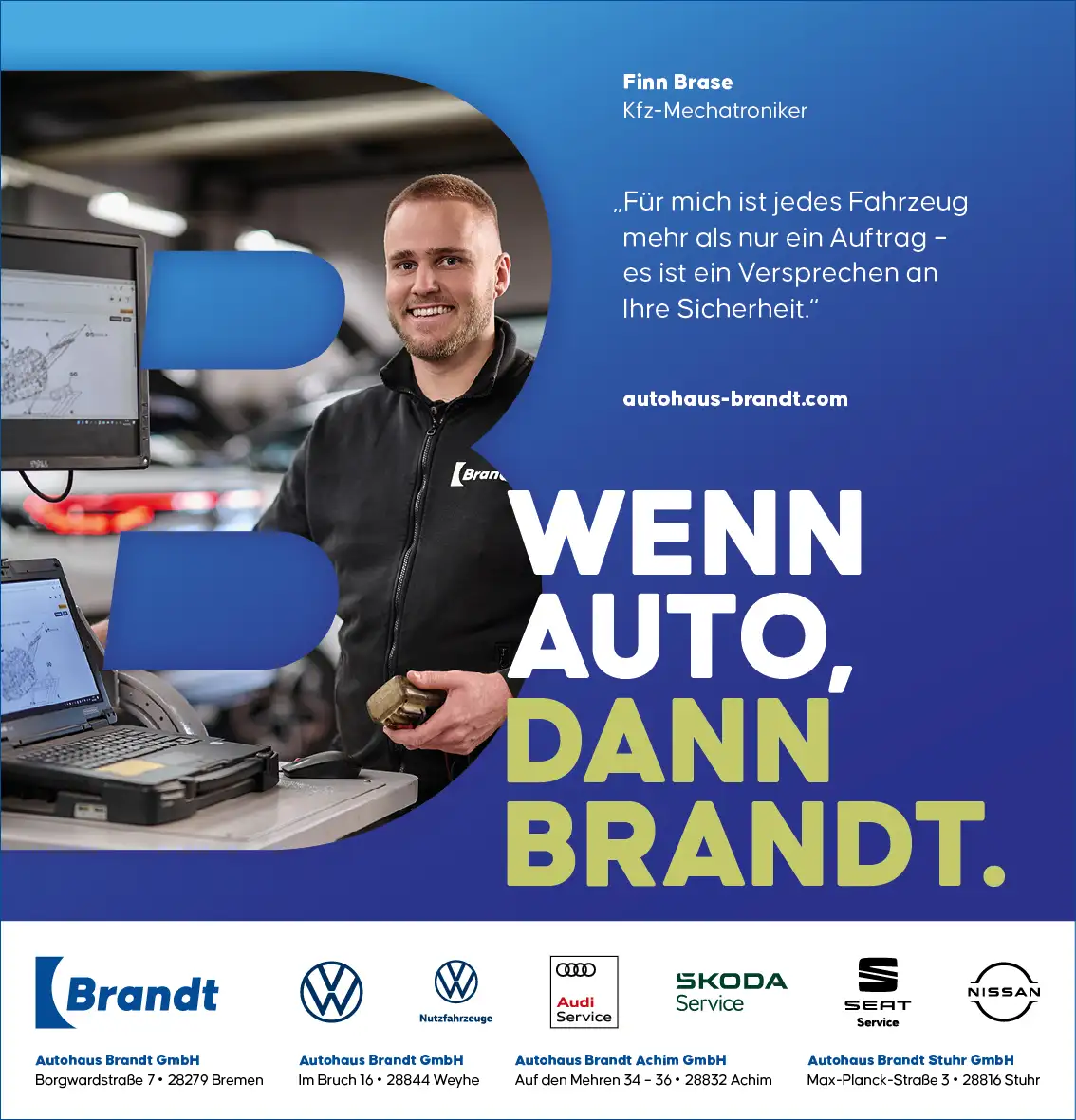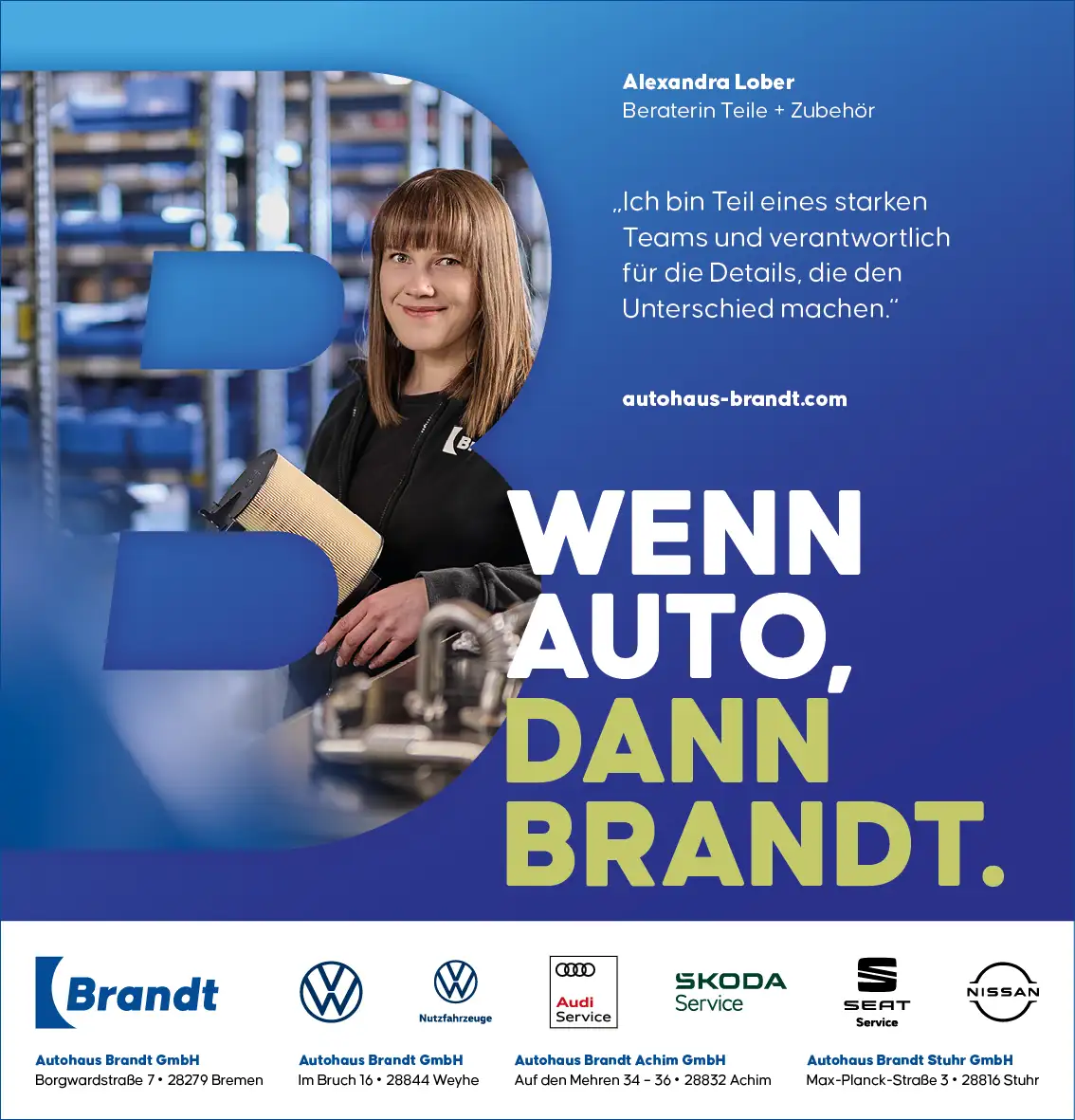 11.01. – Neuwagen08.02. – Alle Leistungen29.03. – Nutzfahrzeuge05.04. – Neuwagen30.04.2025 – Tayron Weser Kurier03.05.2025 – Tayron Kreiszeitung03.05.2025- Weser Report Tayron10.05. – AFA Weser Kurier10.05.25 – Kreiszeitung ID. 410.05. – HU07.06 u. 12.06 – Sonderausgabe Schützenfest Kreiszeitung07.06 – Handwerksmagazin NFZ Weser Kurier11.06 u. 14.06 – Kreiszeitung EU12.06 – Achimer Stadtfest Weser Kurier13.06. u. 27.06. – T-Roc Cabrio KreiszeitungET 20.06.25 – Weser Kurier „Wir vor Ort“, NFZ21.06 – Weser Kurier Unternehmen der Region24.06. – T-Roc Cabrio Weser Kurier24.06. – T-Roc Cabrio Achimer Kurier27.06 – Kreiszeitung12.07 – Finn Brase | Imagekampagne | Weser Kurier Motormarkt19.07 – Taigo Weserreport (Auto Report)29.07.2025 – BREMER August – Alexandra Lober | Imagekampagne | Weser Kurier MotormarktAugust – Anja Willmann | Imagekampagne | LesezirkelSeptember – Marvin Wetjen | Imagekampagne | LesezirkelStarkes Stuhr (Weserreport) – 13.09.25ET 18.09.25 – Kreiszeitung Bremer Magazin – 25.09.Wir vor Ort – 26.09.25Oktober – Philipp Landwehr | Imagekampagne | Weser Kurier MotormarktOktober – Jannik Gudegast | Imagekampagne | LesezirkelOktober – Sophia Klaenfoth | Imagekampagne | LeserkreisET 4.10.25 – WeserreportET 09.10.25 – Weser KurierWirtschaftsstandort Nord (Weser Kurier) – 10.10.25Weserreport – ET 11.10.25Herbstmarkt Syke – ET 24.10.25 Weser Kurier und Kreiszeitung01.11. – Brandt Days | WK-MotormarktNovember – Corinna Wildner | Imagekampagne | Weser Kurier MotormarktNovember – Mika Hüsing | Imagekampagne | LeserkreisDezember – Fiete Reitzner | Imagekampagne | Leserkreis22.11. – Kreiszeitung | Weihnachtsmarkt22.11. – Weserkurier | Weihnachtsmarkt Zurück zur Kalenderübersicht
