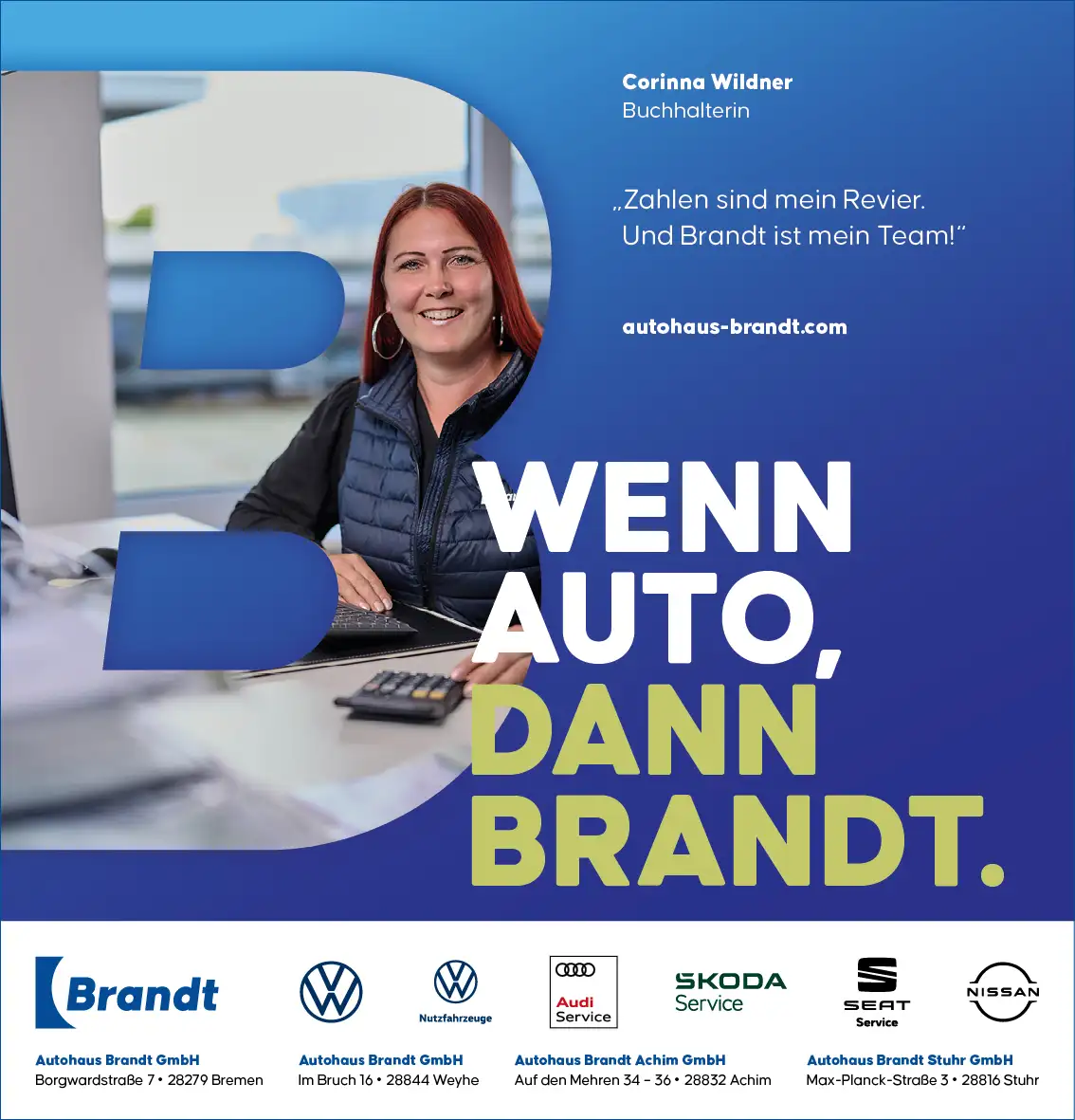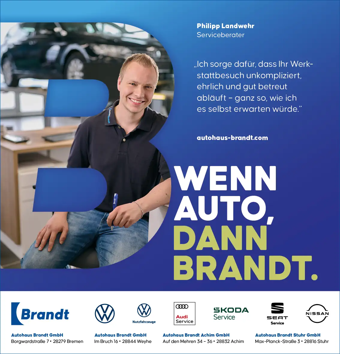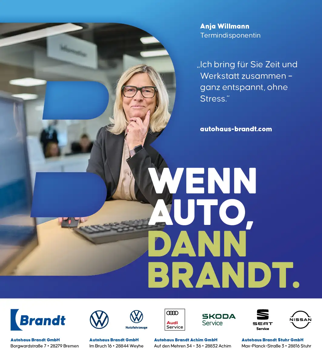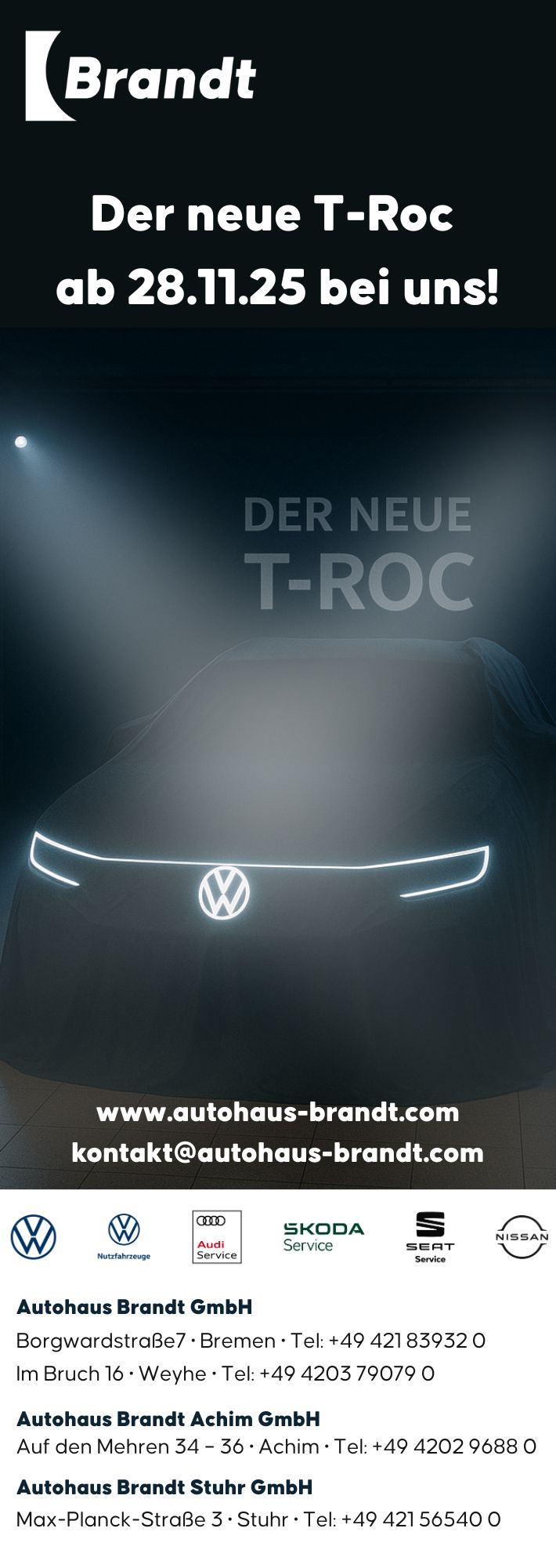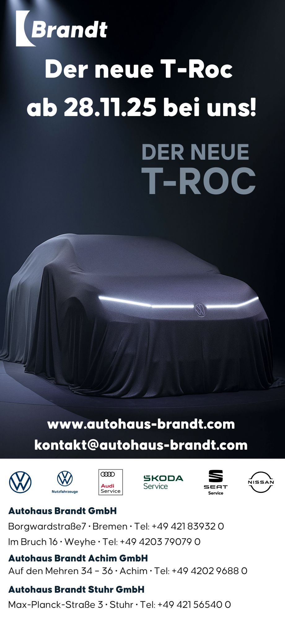 11.01. – Neuwagen08.02. – Alle Leistungen29.03. – Nutzfahrzeuge05.04. – Neuwagen30.04.2025 – Tayron Weser Kurier03.05.2025 – Tayron Kreiszeitung03.05.2025- Weser Report Tayron10.05. – AFA Weser Kurier10.05.25 – Kreiszeitung ID. 410.05. – HU07.06 u. 12.06 – Sonderausgabe Schützenfest Kreiszeitung07.06 – Handwerksmagazin NFZ Weser Kurier11.06 u. 14.06 – Kreiszeitung EU12.06 – Achimer Stadtfest Weser Kurier13.06. u. 27.06. – T-Roc Cabrio KreiszeitungET 20.06.25 – Weser Kurier „Wir vor Ort“, NFZ21.06 – Weser Kurier Unternehmen der Region24.06. – T-Roc Cabrio Weser Kurier24.06. – T-Roc Cabrio Achimer Kurier27.06 – Kreiszeitung12.07 – Finn Brase | Imagekampagne | Weser Kurier Motormarkt19.07 – Taigo Weserreport (Auto Report)29.07.2025 – BREMER August – Alexandra Lober | Imagekampagne | Weser Kurier MotormarktAugust – Anja Willmann | Imagekampagne | LesezirkelSeptember – Marvin Wetjen | Imagekampagne | LesezirkelStarkes Stuhr (Weserreport) – 13.09.25ET 18.09.25 – Kreiszeitung Bremer Magazin – 25.09.Wir vor Ort – 26.09.25Oktober – Philipp Landwehr | Imagekampagne | Weser Kurier MotormarktOktober – Jannik Gudegast | Imagekampagne | LesezirkelOktober – Sophia Klaenfoth | Imagekampagne | LeserkreisET 4.10.25 – WeserreportET 09.10.25 – Weser KurierWirtschaftsstandort Nord (Weser Kurier) – 10.10.25Weserreport – ET 11.10.25Herbstmarkt Syke – ET 24.10.25 Weser Kurier und Kreiszeitung01.11. – Brandt Days | WK-MotormarktNovember – Corinna Wildner | Imagekampagne | Weser Kurier MotormarktNovember – Mika Hüsing | Imagekampagne | LeserkreisDezember – Fiete Reitzner | Imagekampagne | Leserkreis22.11. – Kreiszeitung | Weihnachtsmarkt22.11. – Weserkurier | Weihnachtsmarkt Zurück zur Kalenderübersicht