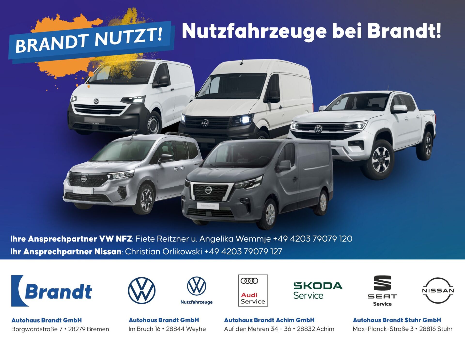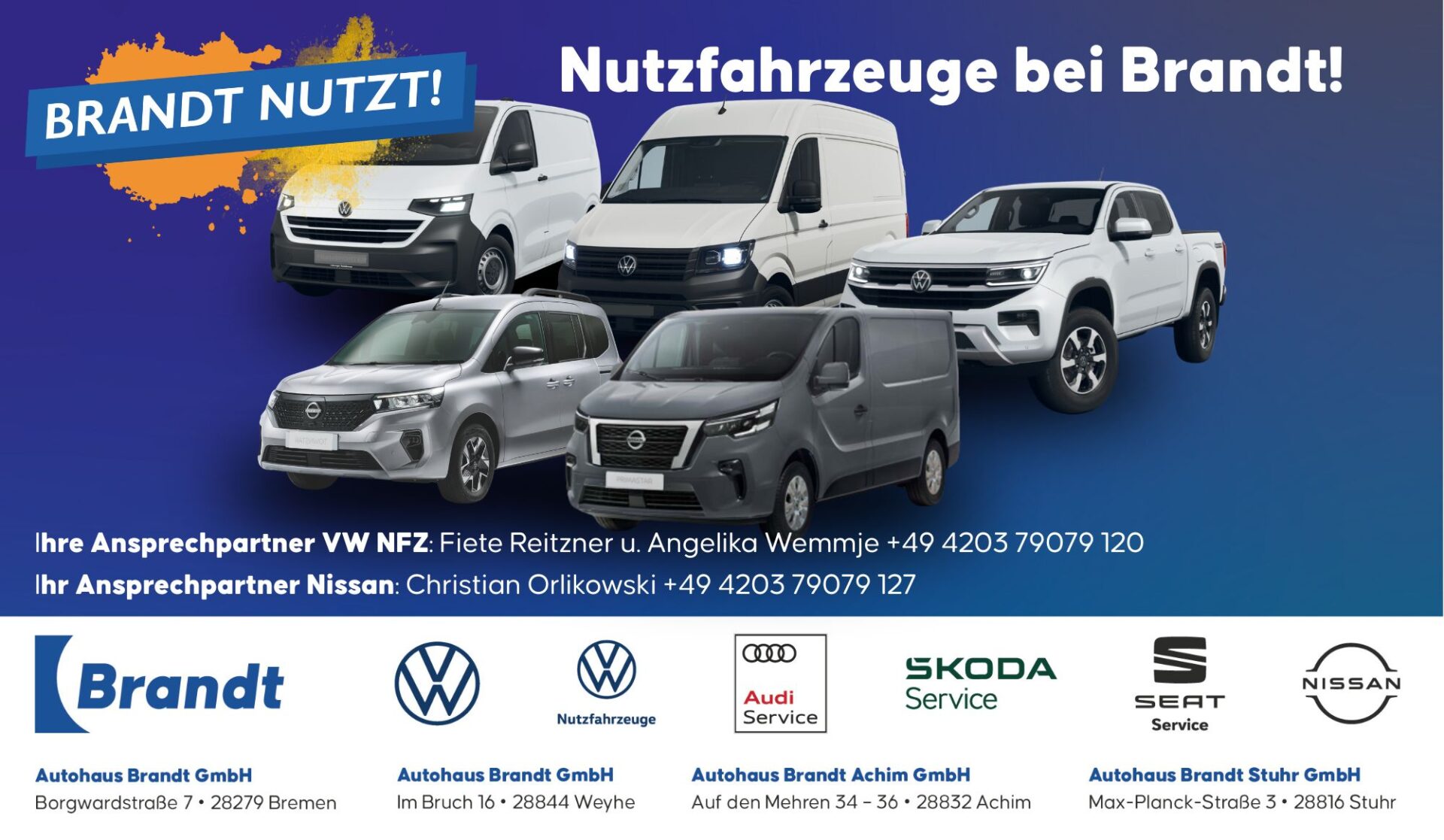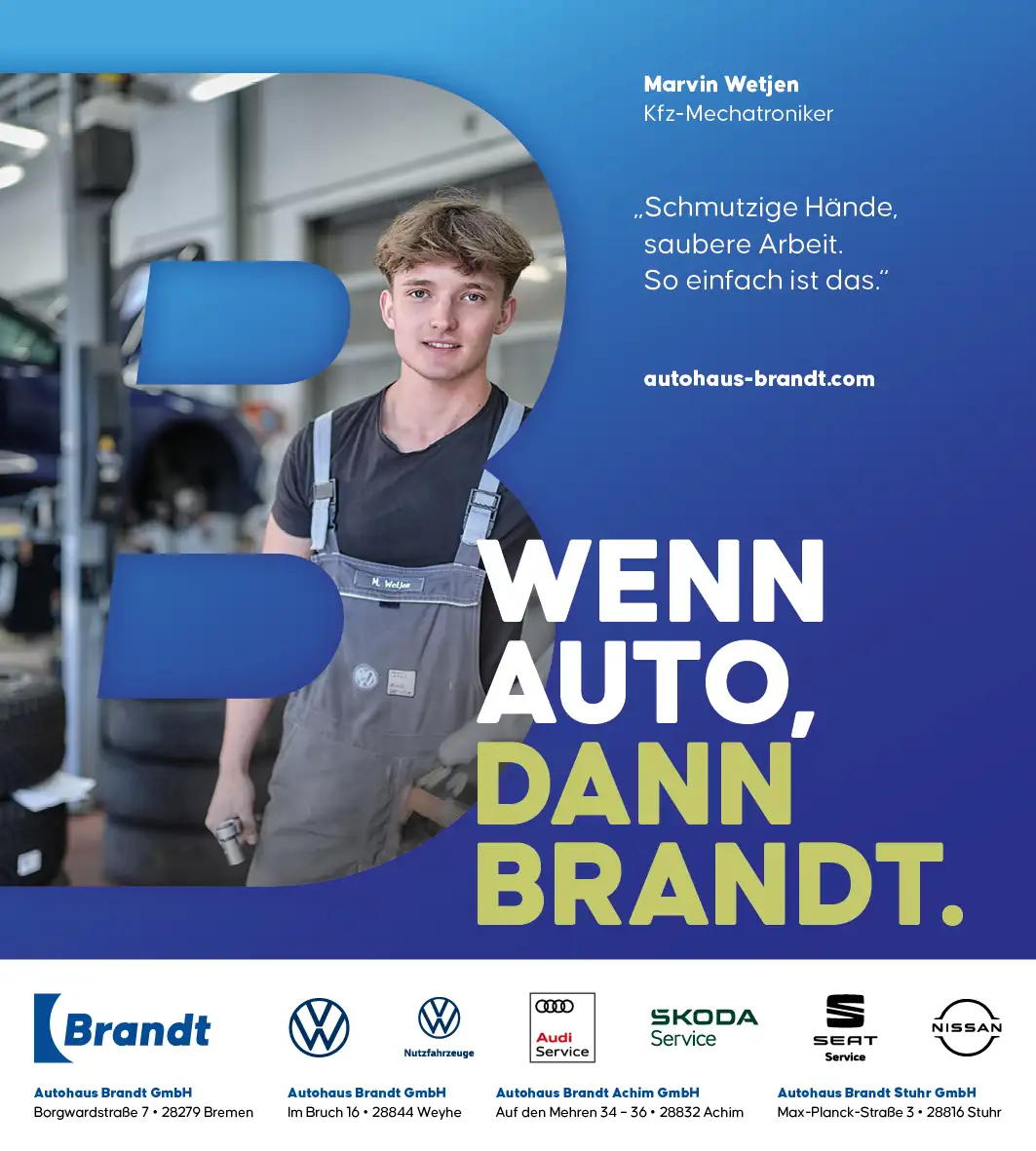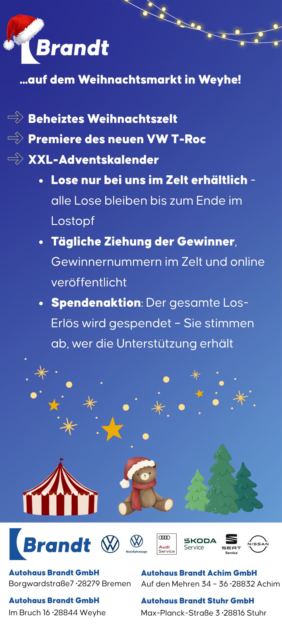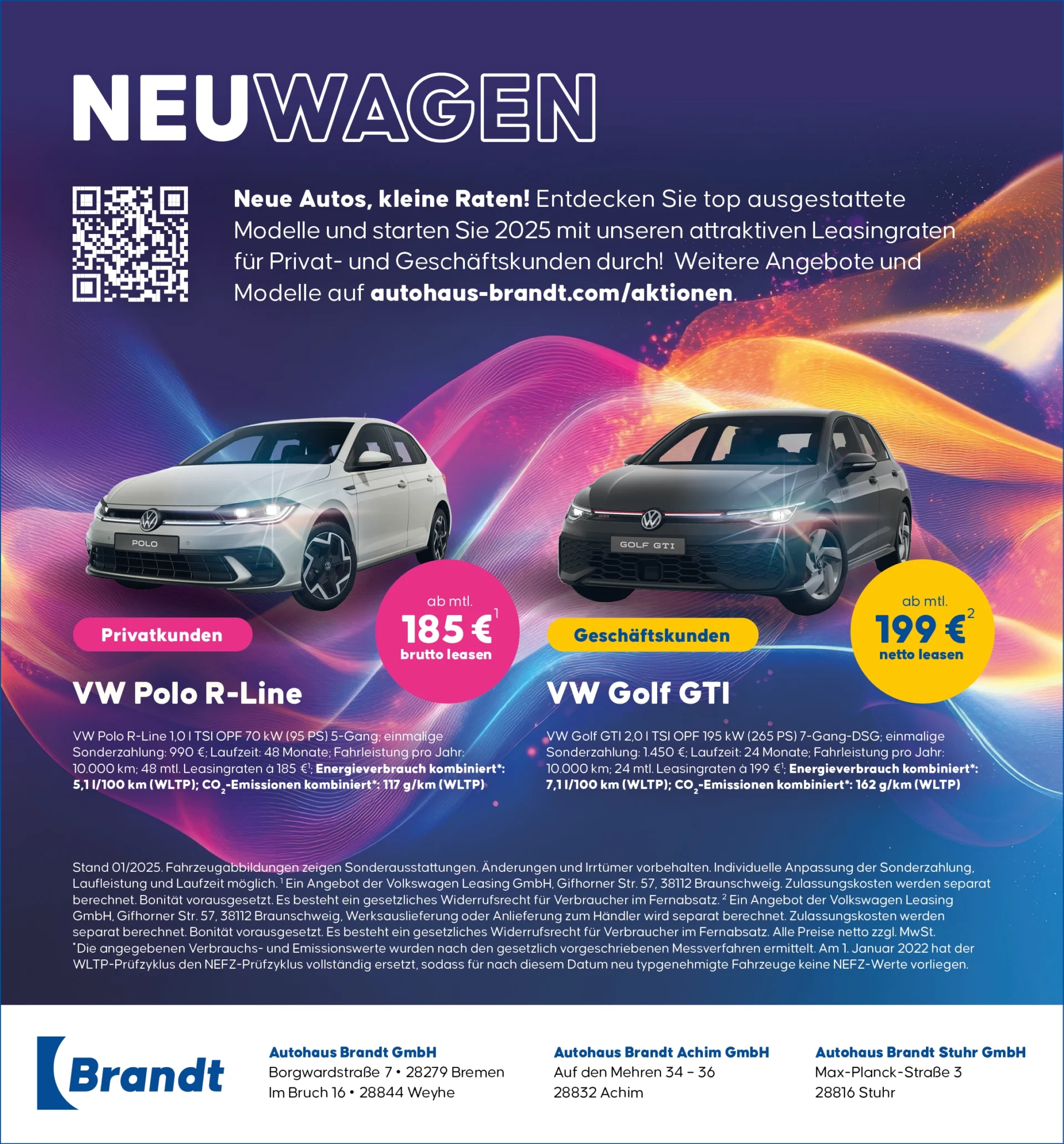 11.01. – Neuwagen08.02. – Alle Leistungen29.03. – Nutzfahrzeuge05.04. – Neuwagen30.04.2025 – Tayron Weser Kurier03.05.2025 – Tayron Kreiszeitung03.05.2025- Weser Report Tayron10.05. – AFA Weser Kurier10.05.25 – Kreiszeitung ID. 410.05. – HU07.06 u. 12.06 – Sonderausgabe Schützenfest Kreiszeitung07.06 – Handwerksmagazin NFZ Weser Kurier11.06 u. 14.06 – Kreiszeitung EU12.06 – Achimer Stadtfest Weser Kurier13.06. u. 27.06. – T-Roc Cabrio KreiszeitungET 20.06.25 – Weser Kurier „Wir vor Ort“, NFZ21.06 – Weser Kurier Unternehmen der Region24.06. – T-Roc Cabrio Weser Kurier24.06. – T-Roc Cabrio Achimer Kurier27.06 – Kreiszeitung12.07 – Finn Brase | Imagekampagne | Weser Kurier Motormarkt19.07 – Taigo Weserreport (Auto Report)29.07.2025 – BREMER August – Alexandra Lober | Imagekampagne | Weser Kurier MotormarktAugust – Anja Willmann | Imagekampagne | LesezirkelSeptember – Marvin Wetjen | Imagekampagne | LesezirkelStarkes Stuhr (Weserreport) – 13.09.25ET 18.09.25 – Kreiszeitung Bremer Magazin – 25.09.Wir vor Ort – 26.09.25Oktober – Philipp Landwehr | Imagekampagne | Weser Kurier MotormarktOktober – Jannik Gudegast | Imagekampagne | LesezirkelOktober – Sophia Klaenfoth | Imagekampagne | LeserkreisET 4.10.25 – WeserreportET 09.10.25 – Weser KurierWirtschaftsstandort Nord (Weser Kurier) – 10.10.25Weserreport – ET 11.10.25Herbstmarkt Syke – ET 24.10.25 Weser Kurier und Kreiszeitung01.11. – Brandt Days | WK-MotormarktNovember – Corinna Wildner | Imagekampagne | Weser Kurier MotormarktNovember – Mika Hüsing | Imagekampagne | LeserkreisDezember – Fiete Reitzner | Imagekampagne | Leserkreis22.11. – Kreiszeitung | Weihnachtsmarkt22.11. – Weserkurier | Weihnachtsmarkt Zurück zur Kalenderübersicht