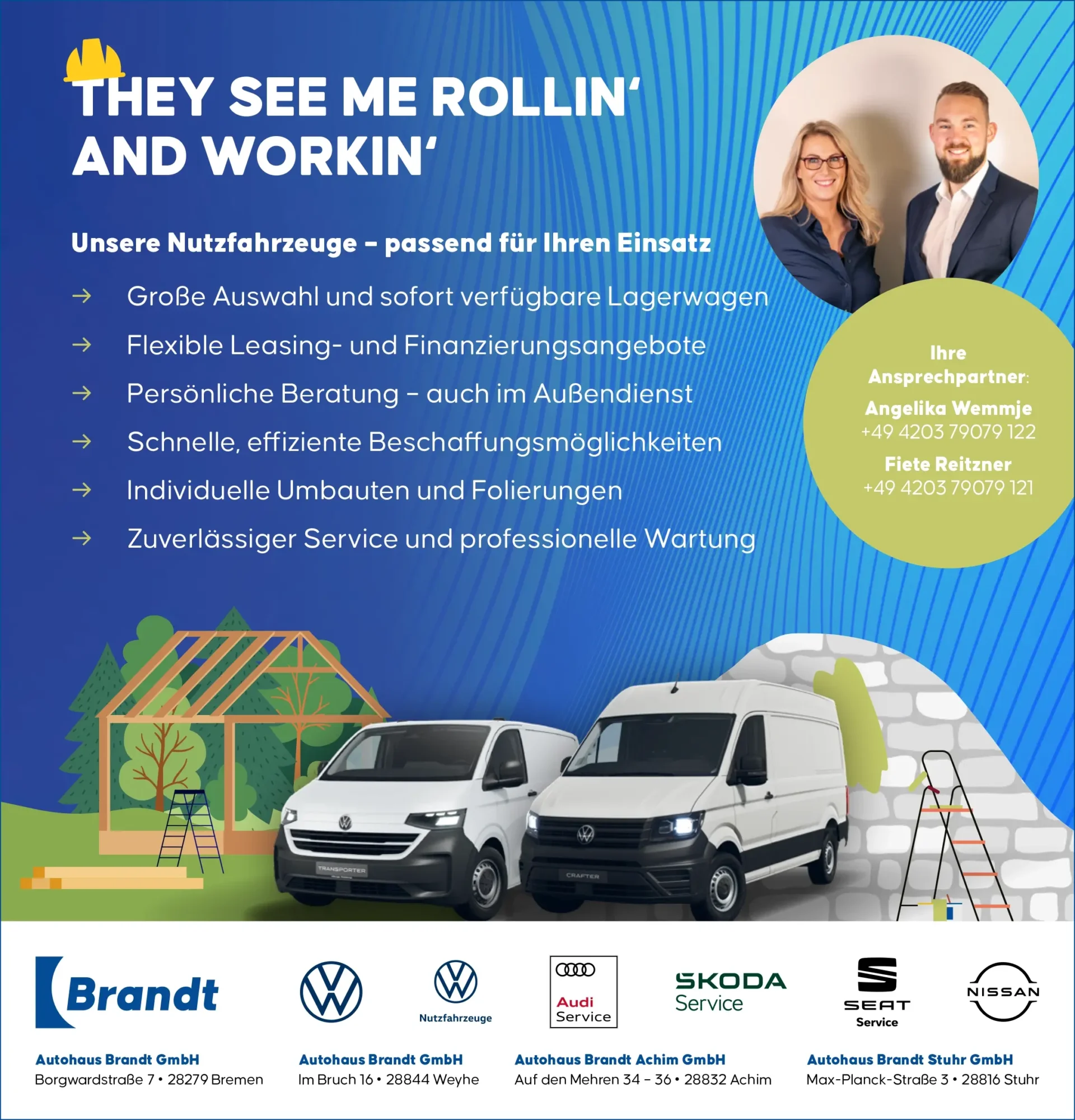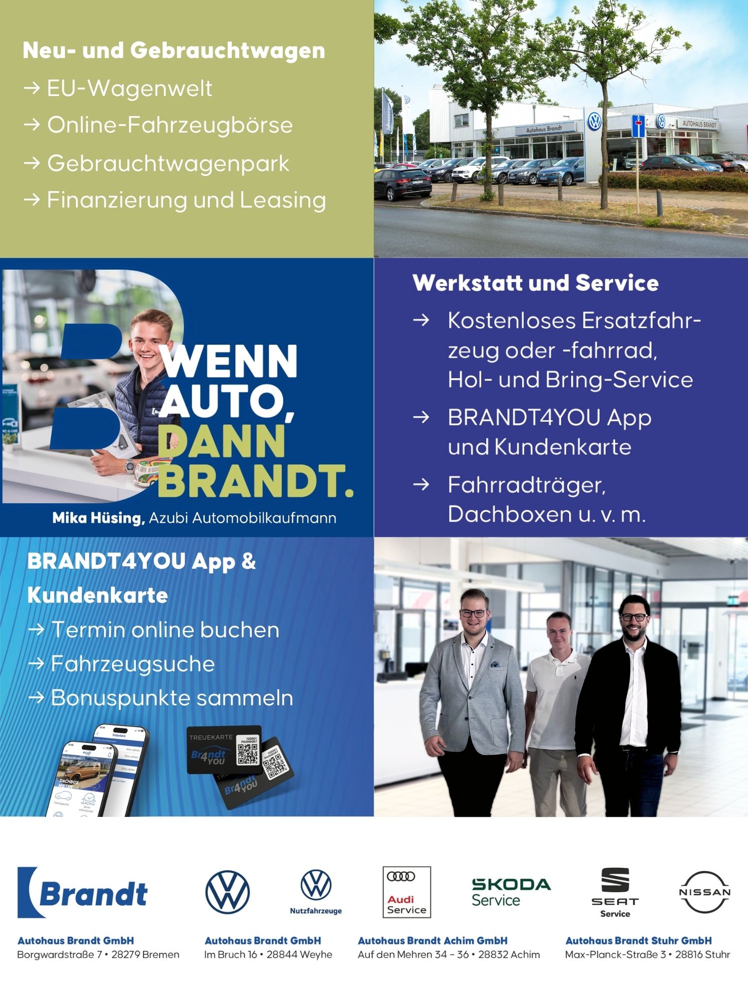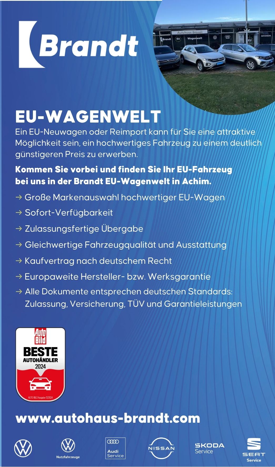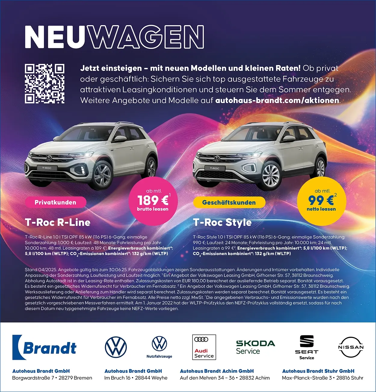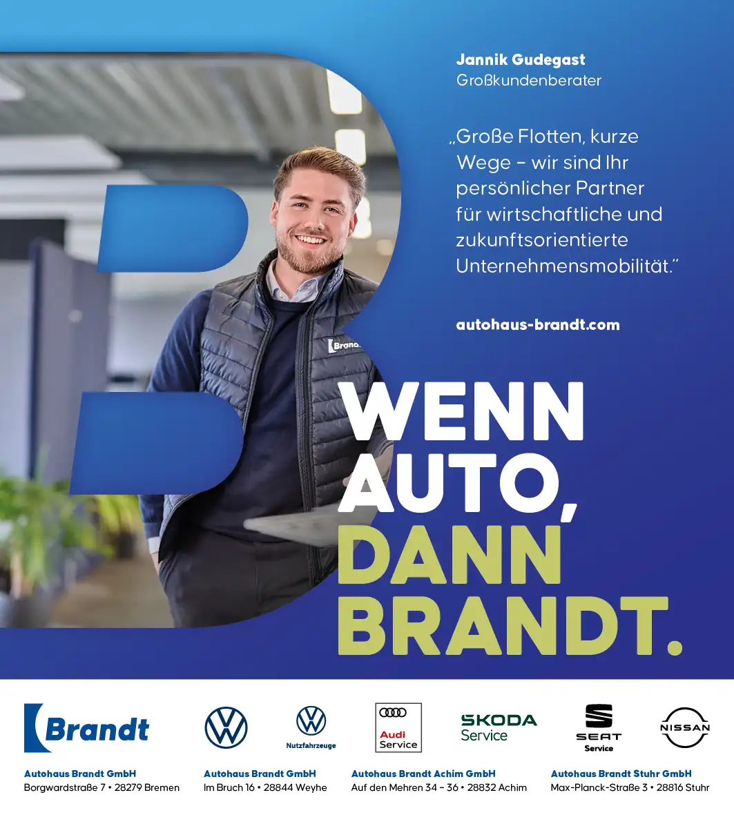 11.01. – Neuwagen08.02. – Alle Leistungen29.03. – Nutzfahrzeuge05.04. – Neuwagen30.04.2025 – Tayron Weser Kurier03.05.2025 – Tayron Kreiszeitung03.05.2025- Weser Report Tayron10.05. – AFA Weser Kurier10.05.25 – Kreiszeitung ID. 410.05. – HU07.06 u. 12.06 – Sonderausgabe Schützenfest Kreiszeitung07.06 – Handwerksmagazin NFZ Weser Kurier11.06 u. 14.06 – Kreiszeitung EU12.06 – Achimer Stadtfest Weser Kurier13.06. u. 27.06. – T-Roc Cabrio KreiszeitungET 20.06.25 – Weser Kurier „Wir vor Ort“, NFZ21.06 – Weser Kurier Unternehmen der Region24.06. – T-Roc Cabrio Weser Kurier24.06. – T-Roc Cabrio Achimer Kurier27.06 – Kreiszeitung12.07 – Finn Brase | Imagekampagne | Weser Kurier Motormarkt19.07 – Taigo Weserreport (Auto Report)29.07.2025 – BREMER August – Alexandra Lober | Imagekampagne | Weser Kurier MotormarktAugust – Anja Willmann | Imagekampagne | LesezirkelSeptember – Marvin Wetjen | Imagekampagne | LesezirkelStarkes Stuhr (Weserreport) – 13.09.25ET 18.09.25 – Kreiszeitung Bremer Magazin – 25.09.Wir vor Ort – 26.09.25Oktober – Philipp Landwehr | Imagekampagne | Weser Kurier MotormarktOktober – Jannik Gudegast | Imagekampagne | LesezirkelOktober – Sophia Klaenfoth | Imagekampagne | LeserkreisET 4.10.25 – WeserreportET 09.10.25 – Weser KurierWirtschaftsstandort Nord (Weser Kurier) – 10.10.25Weserreport – ET 11.10.25Herbstmarkt Syke – ET 24.10.25 Weser Kurier und Kreiszeitung01.11. – Brandt Days | WK-MotormarktNovember – Corinna Wildner | Imagekampagne | Weser Kurier MotormarktNovember – Mika Hüsing | Imagekampagne | LeserkreisDezember – Fiete Reitzner | Imagekampagne | Leserkreis22.11. – Kreiszeitung | Weihnachtsmarkt22.11. – Weserkurier | Weihnachtsmarkt Zurück zur Kalenderübersicht