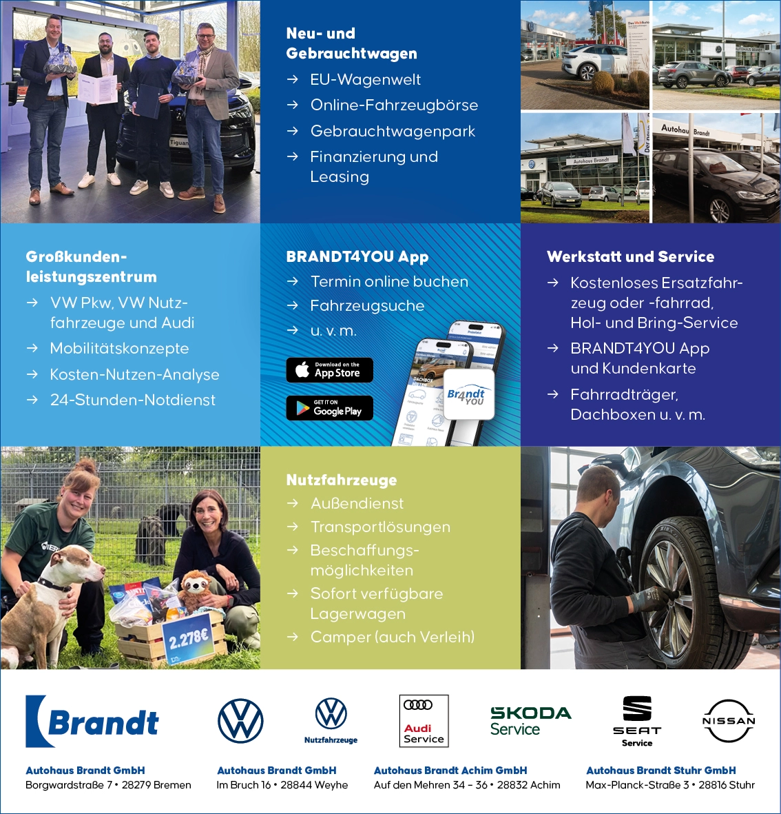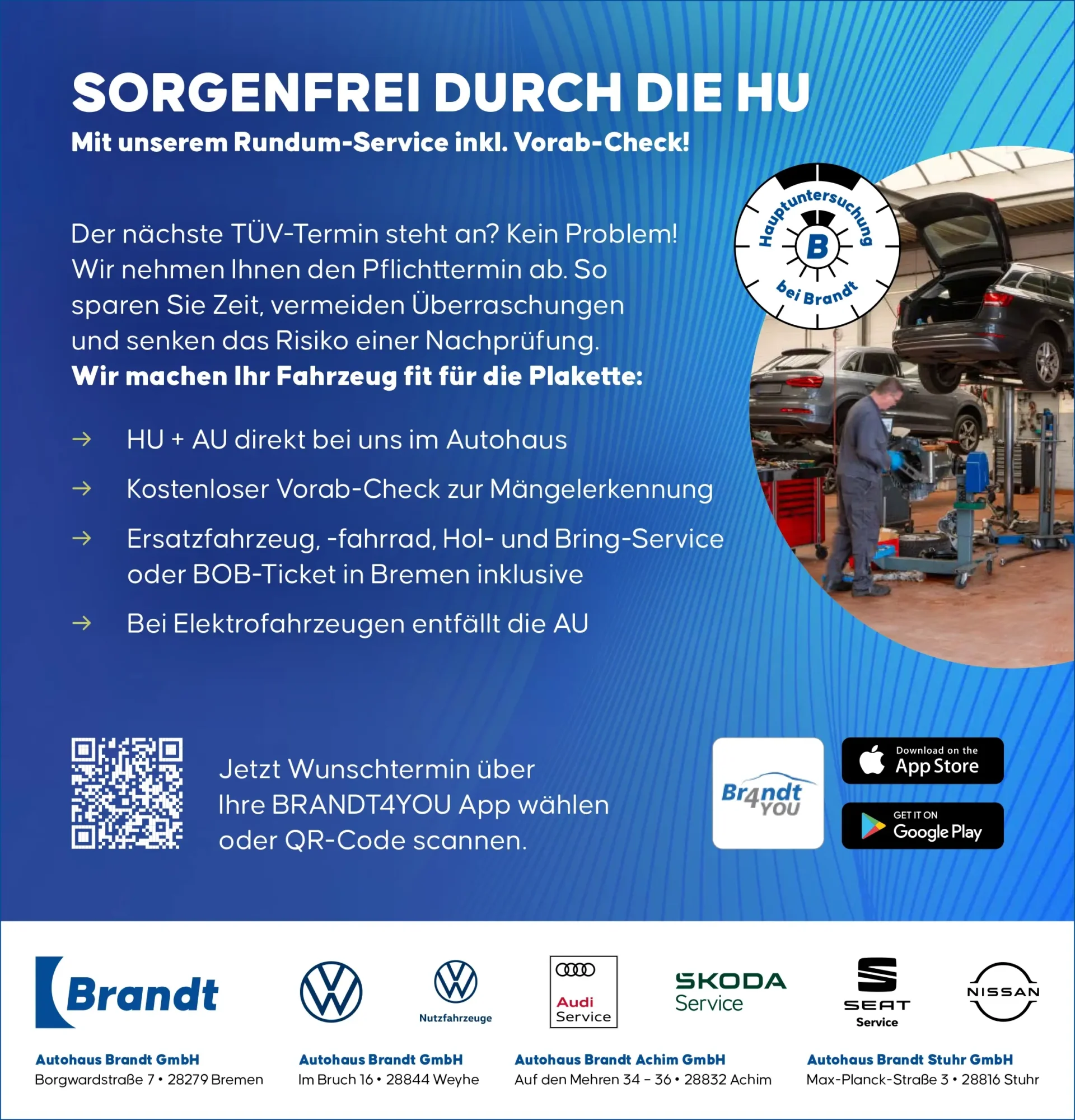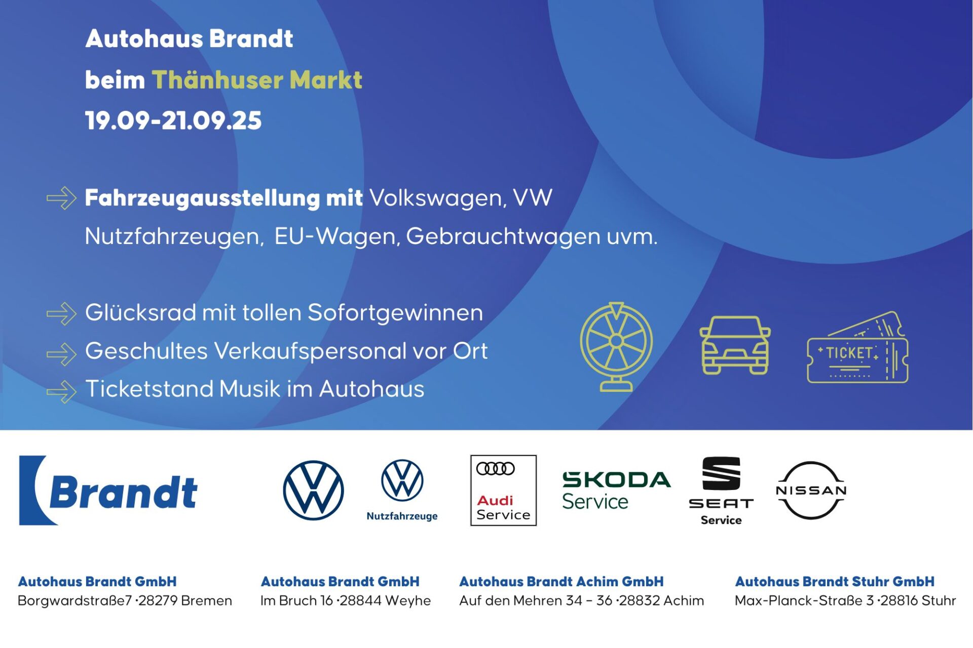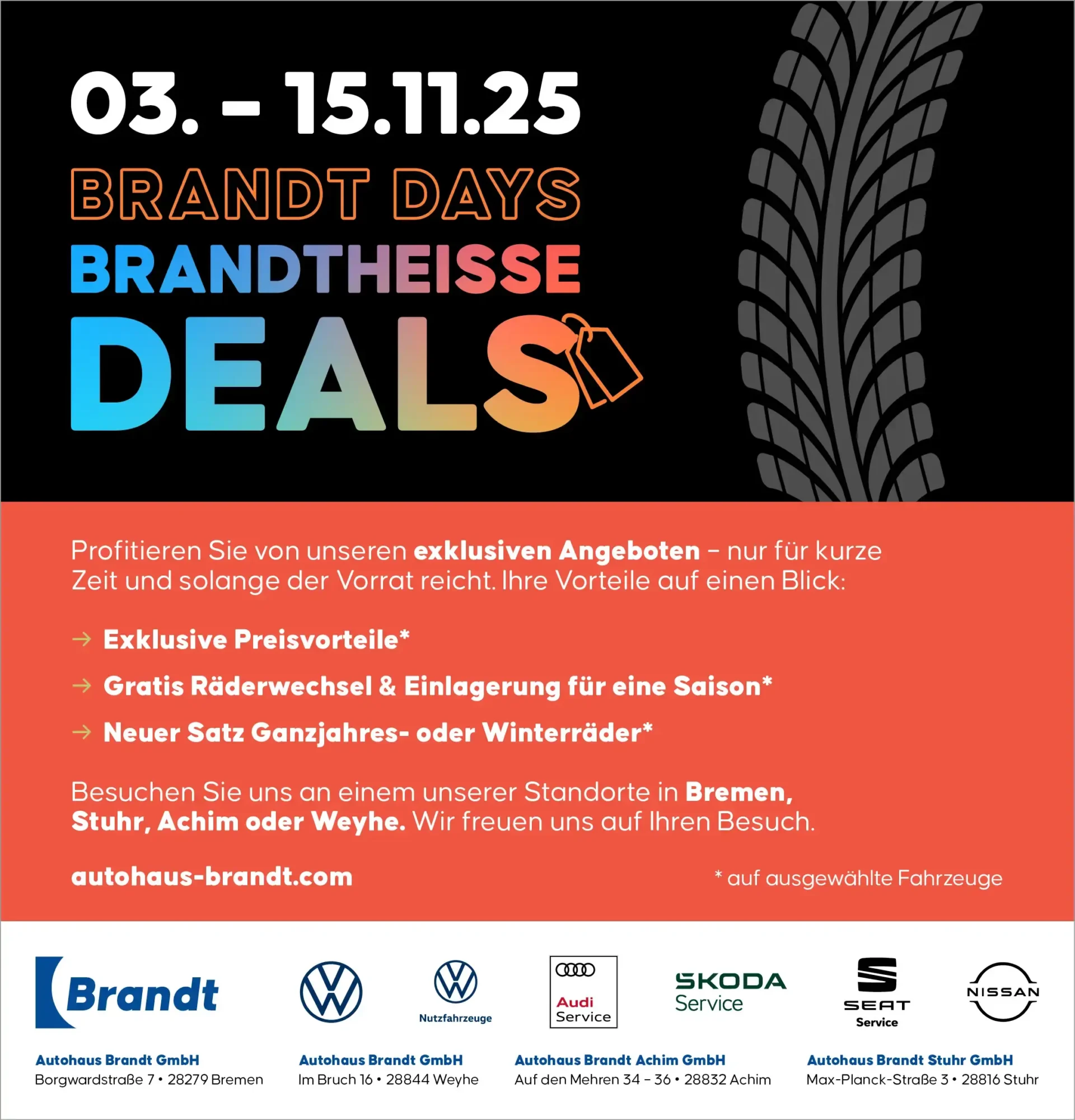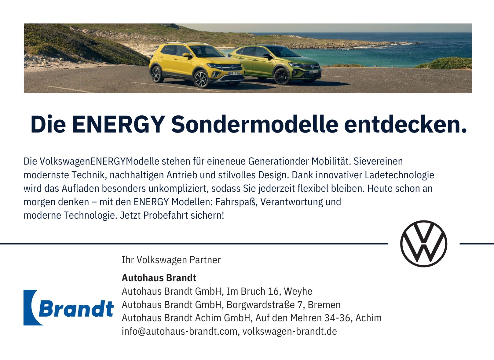11.01. – Neuwagen08.02. – Alle Leistungen29.03. – Nutzfahrzeuge05.04. – Neuwagen30.04.2025 – Tayron Weser Kurier03.05.2025 – Tayron Kreiszeitung03.05.2025- Weser Report Tayron10.05. – AFA Weser Kurier10.05.25 – Kreiszeitung ID. 410.05. – HU07.06 u. 12.06 – Sonderausgabe Schützenfest Kreiszeitung07.06 – Handwerksmagazin NFZ Weser Kurier11.06 u. 14.06 – Kreiszeitung EU12.06 – Achimer Stadtfest Weser Kurier13.06. u. 27.06. – T-Roc Cabrio KreiszeitungET 20.06.25 – Weser Kurier „Wir vor Ort“, NFZ21.06 – Weser Kurier Unternehmen der Region24.06. – T-Roc Cabrio Weser Kurier24.06. – T-Roc Cabrio Achimer Kurier27.06 – Kreiszeitung12.07 – Finn Brase | Imagekampagne | Weser Kurier Motormarkt19.07 – Taigo Weserreport (Auto Report)29.07.2025 – BREMER August – Alexandra Lober | Imagekampagne | Weser Kurier MotormarktAugust – Anja Willmann | Imagekampagne | LesezirkelSeptember – Marvin Wetjen | Imagekampagne | LesezirkelStarkes Stuhr (Weserreport) – 13.09.25ET 18.09.25 – Kreiszeitung Bremer Magazin – 25.09.Wir vor Ort – 26.09.25Oktober – Philipp Landwehr | Imagekampagne | Weser Kurier MotormarktOktober – Jannik Gudegast | Imagekampagne | LesezirkelOktober – Sophia Klaenfoth | Imagekampagne | LeserkreisET 4.10.25 – WeserreportET 09.10.25 – Weser KurierWirtschaftsstandort Nord (Weser Kurier) – 10.10.25Weserreport – ET 11.10.25Herbstmarkt Syke – ET 24.10.25 Weser Kurier und Kreiszeitung01.11. – Brandt Days | WK-MotormarktNovember – Corinna Wildner | Imagekampagne | Weser Kurier MotormarktNovember – Mika Hüsing | Imagekampagne | LeserkreisDezember – Fiete Reitzner | Imagekampagne | Leserkreis22.11. – Kreiszeitung | Weihnachtsmarkt22.11. – Weserkurier | Weihnachtsmarkt Zurück zur Kalenderübersicht