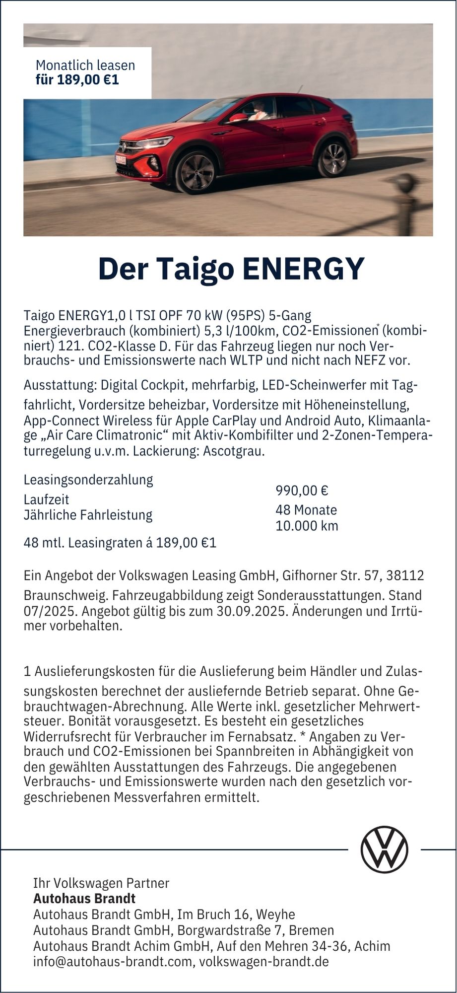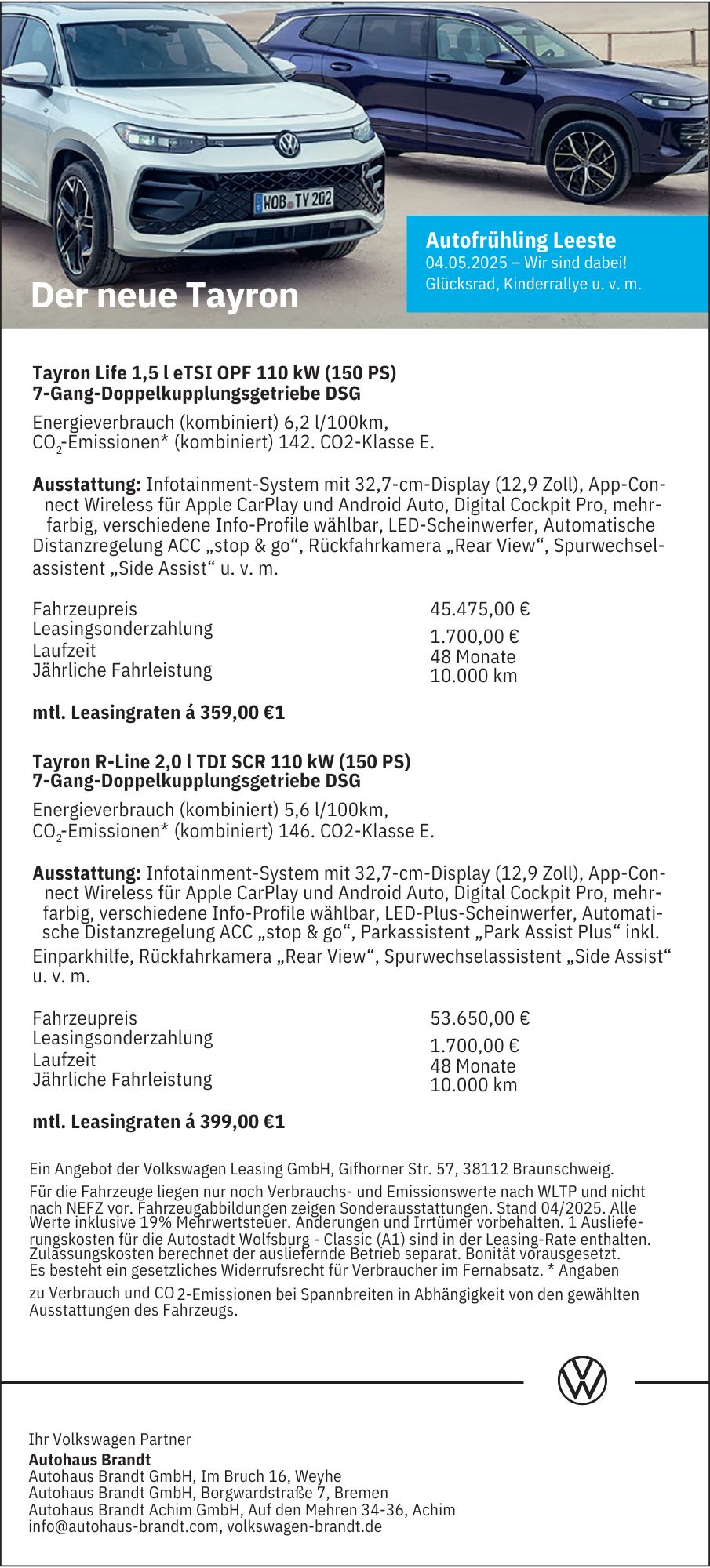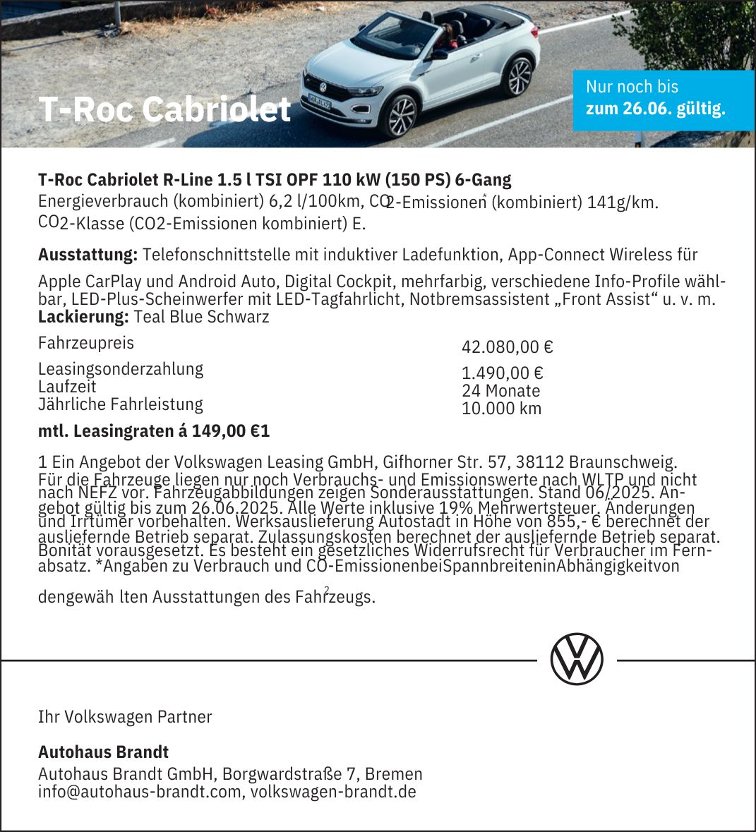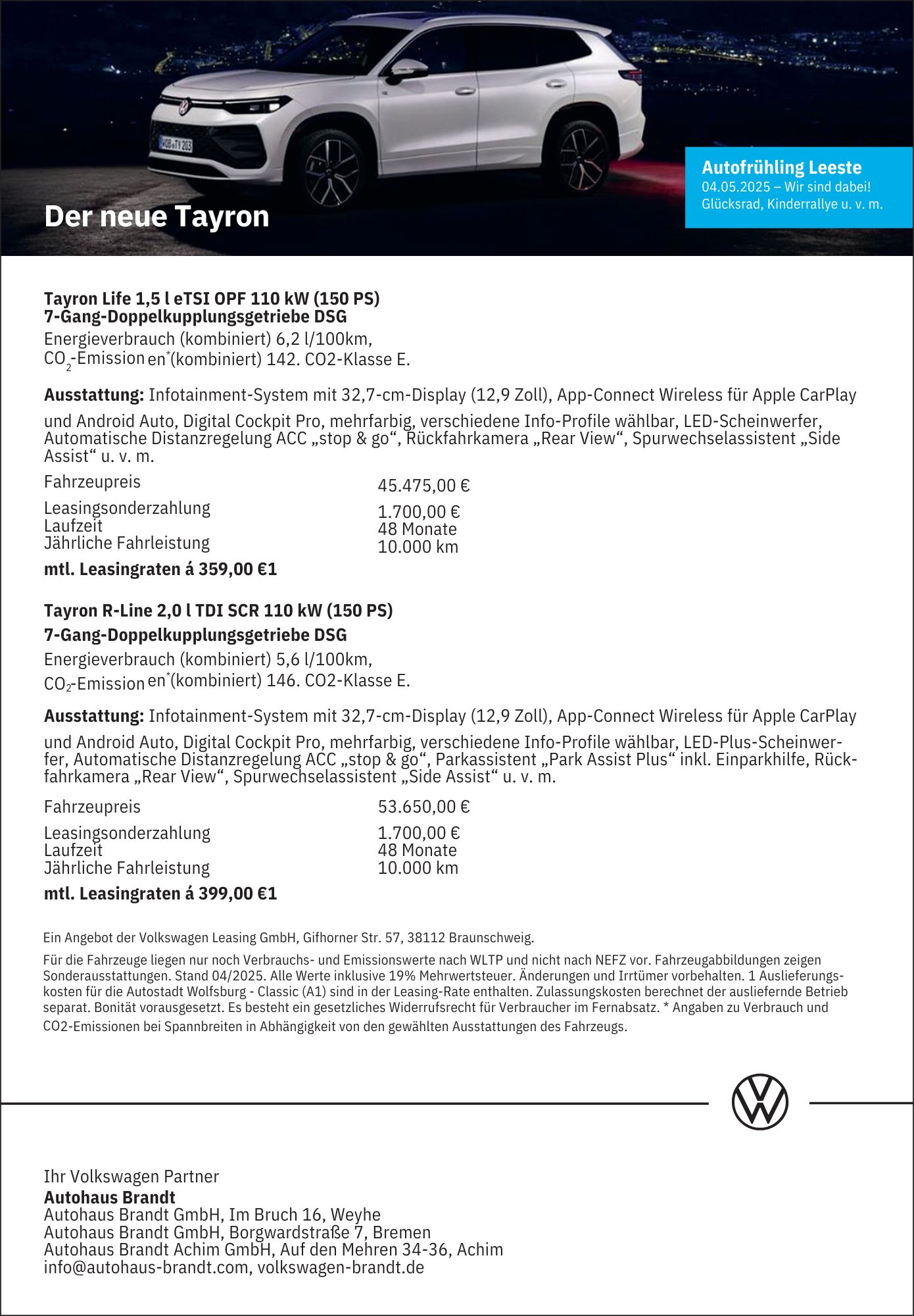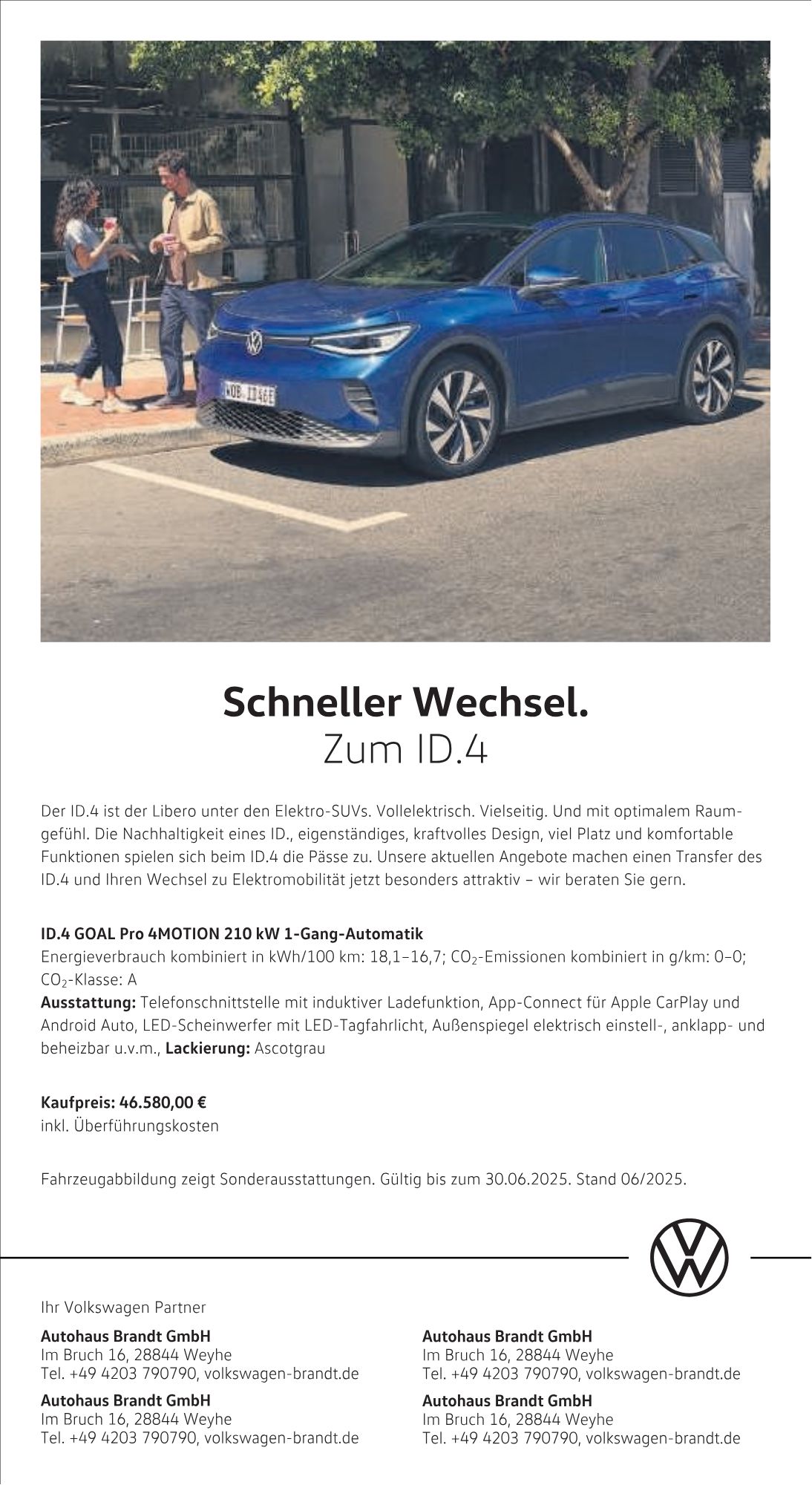 11.01. – Neuwagen08.02. – Alle Leistungen29.03. – Nutzfahrzeuge05.04. – Neuwagen30.04.2025 – Tayron Weser Kurier03.05.2025 – Tayron Kreiszeitung03.05.2025- Weser Report Tayron10.05. – AFA Weser Kurier10.05.25 – Kreiszeitung ID. 410.05. – HU07.06 u. 12.06 – Sonderausgabe Schützenfest Kreiszeitung07.06 – Handwerksmagazin NFZ Weser Kurier11.06 u. 14.06 – Kreiszeitung EU12.06 – Achimer Stadtfest Weser Kurier13.06. u. 27.06. – T-Roc Cabrio KreiszeitungET 20.06.25 – Weser Kurier „Wir vor Ort“, NFZ21.06 – Weser Kurier Unternehmen der Region24.06. – T-Roc Cabrio Weser Kurier24.06. – T-Roc Cabrio Achimer Kurier27.06 – Kreiszeitung12.07 – Finn Brase | Imagekampagne | Weser Kurier Motormarkt19.07 – Taigo Weserreport (Auto Report)29.07.2025 – BREMER August – Alexandra Lober | Imagekampagne | Weser Kurier MotormarktAugust – Anja Willmann | Imagekampagne | LesezirkelSeptember – Marvin Wetjen | Imagekampagne | LesezirkelStarkes Stuhr (Weserreport) – 13.09.25ET 18.09.25 – Kreiszeitung Bremer Magazin – 25.09.Wir vor Ort – 26.09.25Oktober – Philipp Landwehr | Imagekampagne | Weser Kurier MotormarktOktober – Jannik Gudegast | Imagekampagne | LesezirkelOktober – Sophia Klaenfoth | Imagekampagne | LeserkreisET 4.10.25 – WeserreportET 09.10.25 – Weser KurierWirtschaftsstandort Nord (Weser Kurier) – 10.10.25Weserreport – ET 11.10.25Herbstmarkt Syke – ET 24.10.25 Weser Kurier und Kreiszeitung01.11. – Brandt Days | WK-MotormarktNovember – Corinna Wildner | Imagekampagne | Weser Kurier MotormarktNovember – Mika Hüsing | Imagekampagne | LeserkreisDezember – Fiete Reitzner | Imagekampagne | Leserkreis22.11. – Kreiszeitung | Weihnachtsmarkt22.11. – Weserkurier | Weihnachtsmarkt Zurück zur Kalenderübersicht