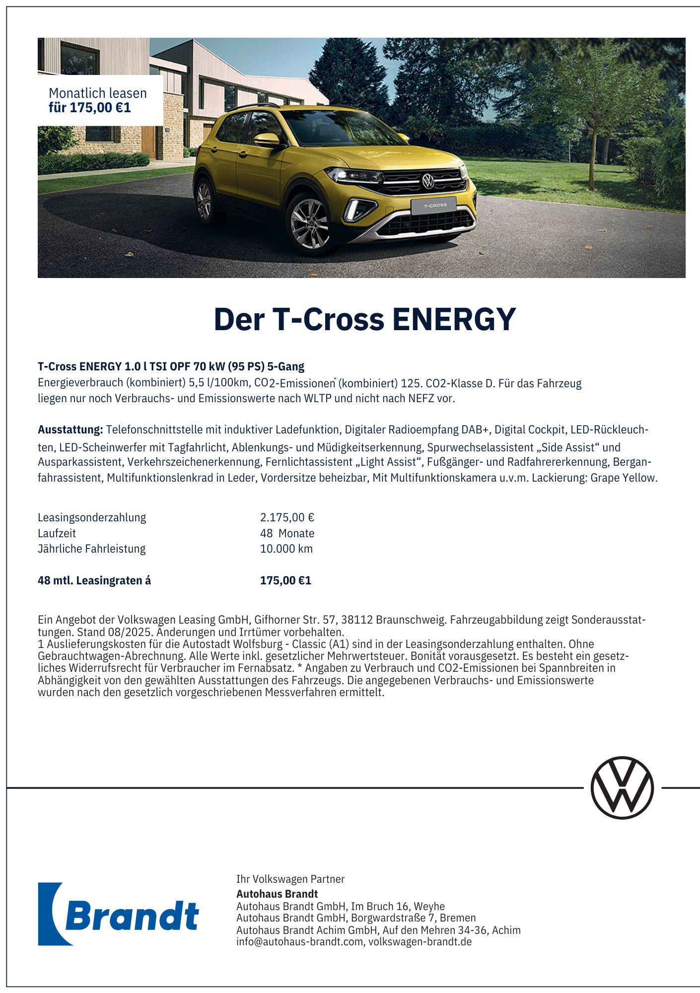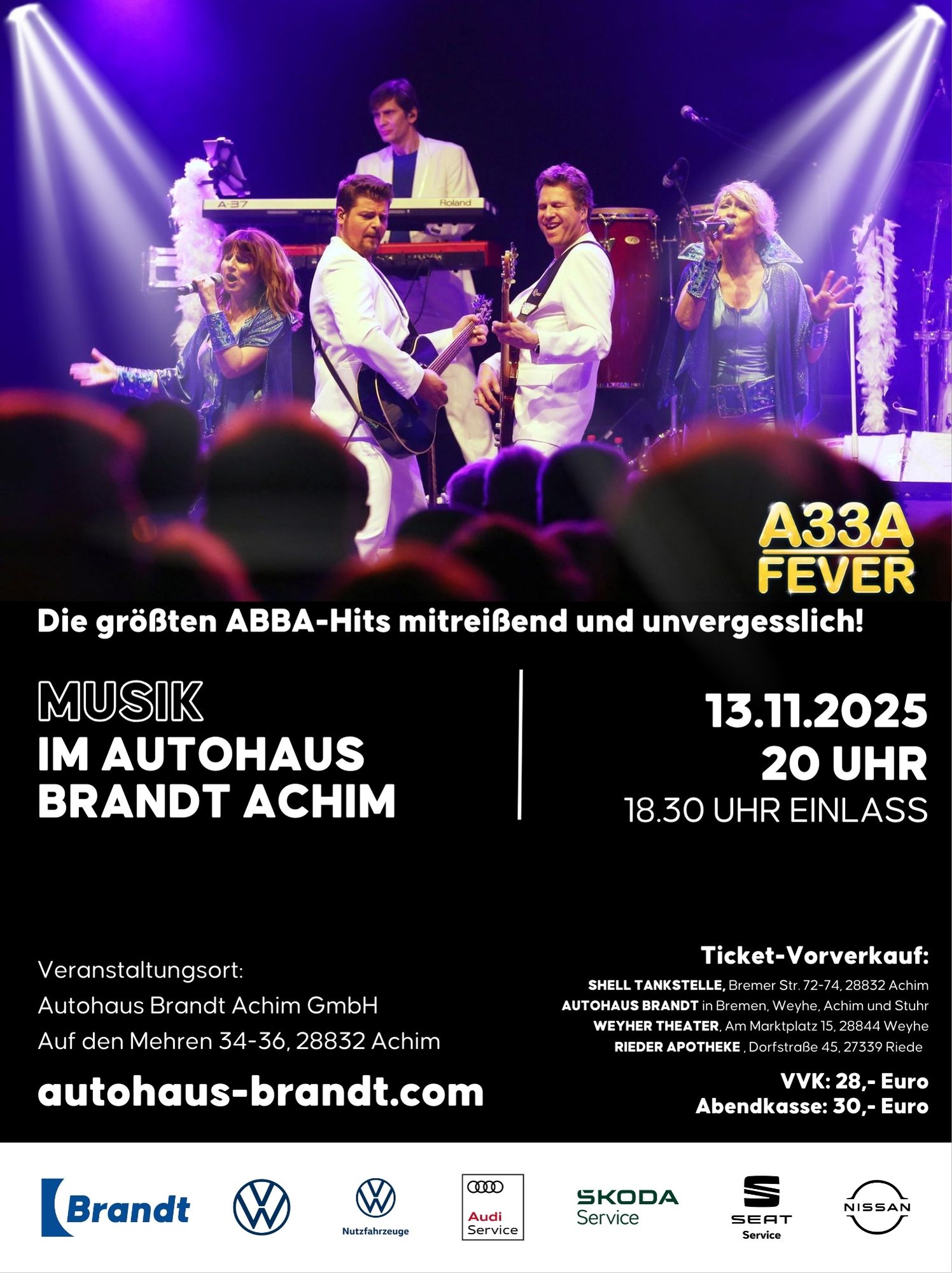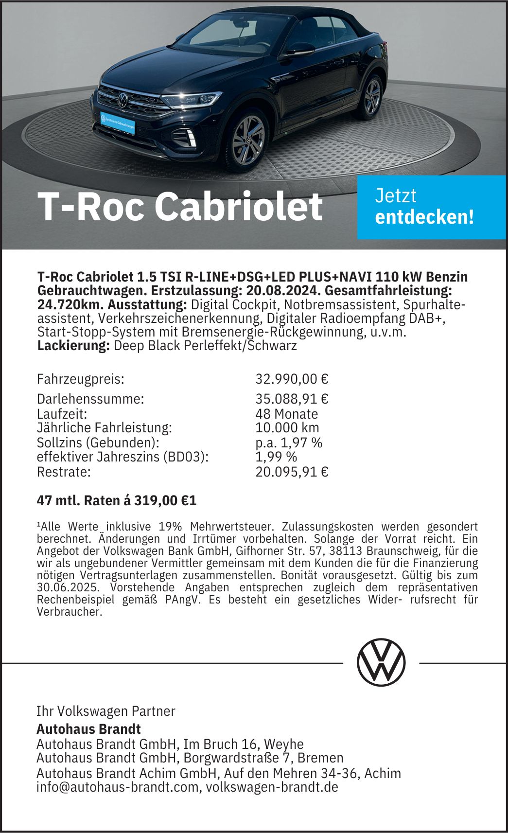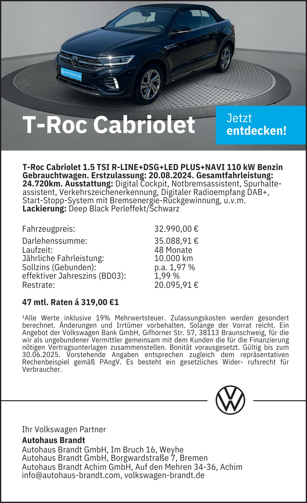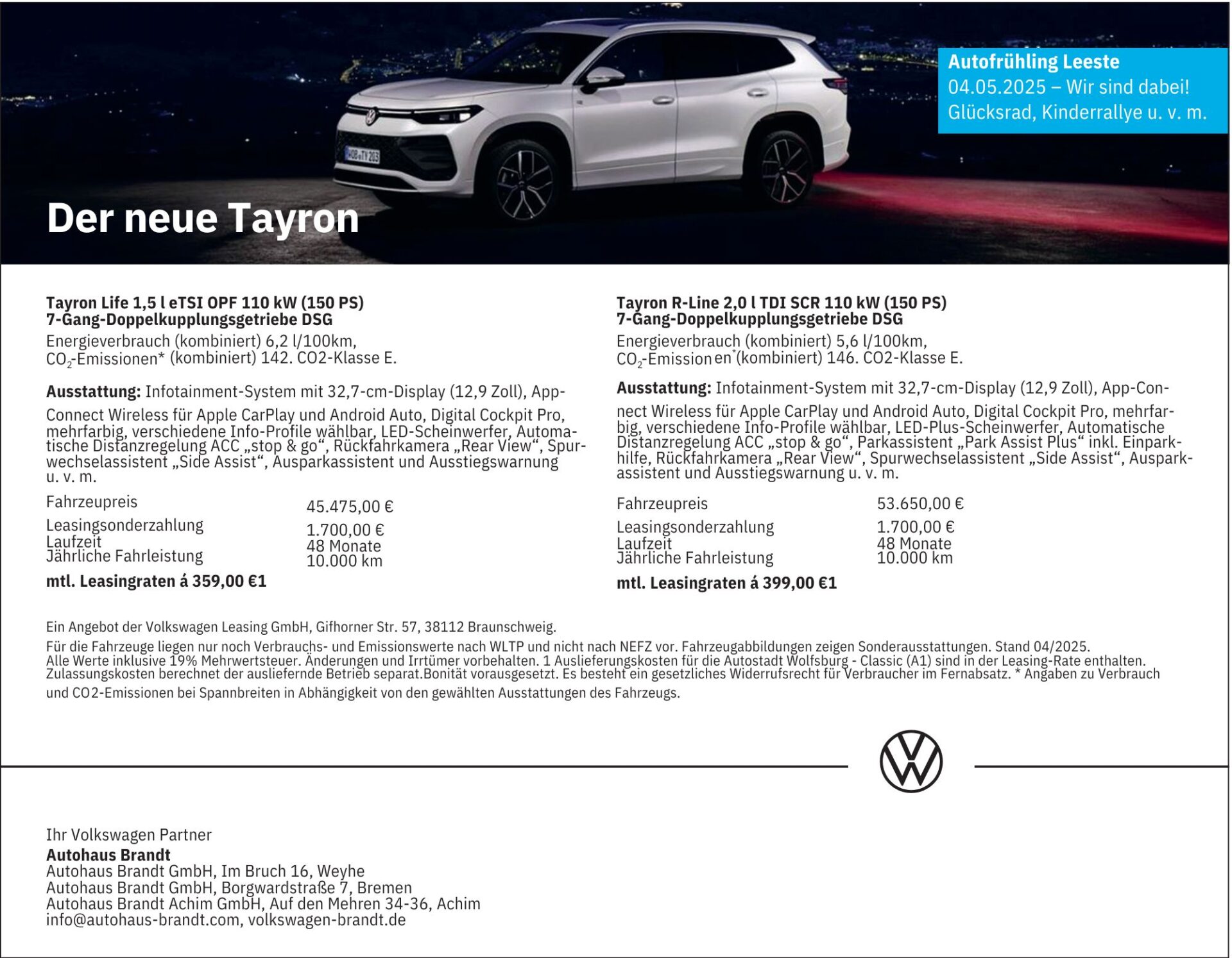 11.01. – Neuwagen08.02. – Alle Leistungen29.03. – Nutzfahrzeuge05.04. – Neuwagen30.04.2025 – Tayron Weser Kurier03.05.2025 – Tayron Kreiszeitung03.05.2025- Weser Report Tayron10.05. – AFA Weser Kurier10.05.25 – Kreiszeitung ID. 410.05. – HU07.06 u. 12.06 – Sonderausgabe Schützenfest Kreiszeitung07.06 – Handwerksmagazin NFZ Weser Kurier11.06 u. 14.06 – Kreiszeitung EU12.06 – Achimer Stadtfest Weser Kurier13.06. u. 27.06. – T-Roc Cabrio KreiszeitungET 20.06.25 – Weser Kurier „Wir vor Ort“, NFZ21.06 – Weser Kurier Unternehmen der Region24.06. – T-Roc Cabrio Weser Kurier24.06. – T-Roc Cabrio Achimer Kurier27.06 – Kreiszeitung12.07 – Finn Brase | Imagekampagne | Weser Kurier Motormarkt19.07 – Taigo Weserreport (Auto Report)29.07.2025 – BREMER August – Alexandra Lober | Imagekampagne | Weser Kurier MotormarktAugust – Anja Willmann | Imagekampagne | LesezirkelSeptember – Marvin Wetjen | Imagekampagne | LesezirkelStarkes Stuhr (Weserreport) – 13.09.25ET 18.09.25 – Kreiszeitung Bremer Magazin – 25.09.Wir vor Ort – 26.09.25Oktober – Philipp Landwehr | Imagekampagne | Weser Kurier MotormarktOktober – Jannik Gudegast | Imagekampagne | LesezirkelOktober – Sophia Klaenfoth | Imagekampagne | LeserkreisET 4.10.25 – WeserreportET 09.10.25 – Weser KurierWirtschaftsstandort Nord (Weser Kurier) – 10.10.25Weserreport – ET 11.10.25Herbstmarkt Syke – ET 24.10.25 Weser Kurier und Kreiszeitung01.11. – Brandt Days | WK-MotormarktNovember – Corinna Wildner | Imagekampagne | Weser Kurier MotormarktNovember – Mika Hüsing | Imagekampagne | LeserkreisDezember – Fiete Reitzner | Imagekampagne | Leserkreis22.11. – Kreiszeitung | Weihnachtsmarkt22.11. – Weserkurier | Weihnachtsmarkt Zurück zur Kalenderübersicht
